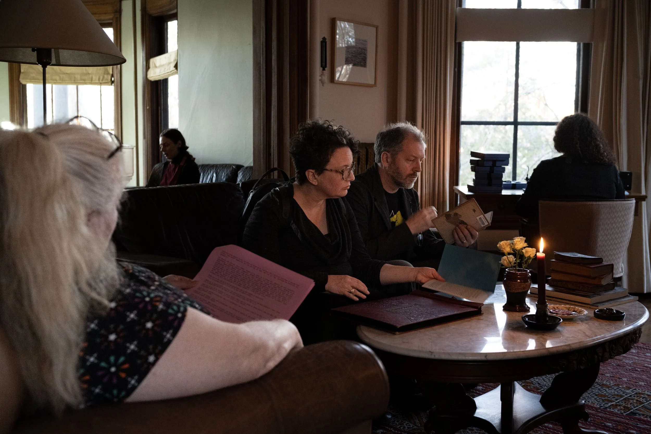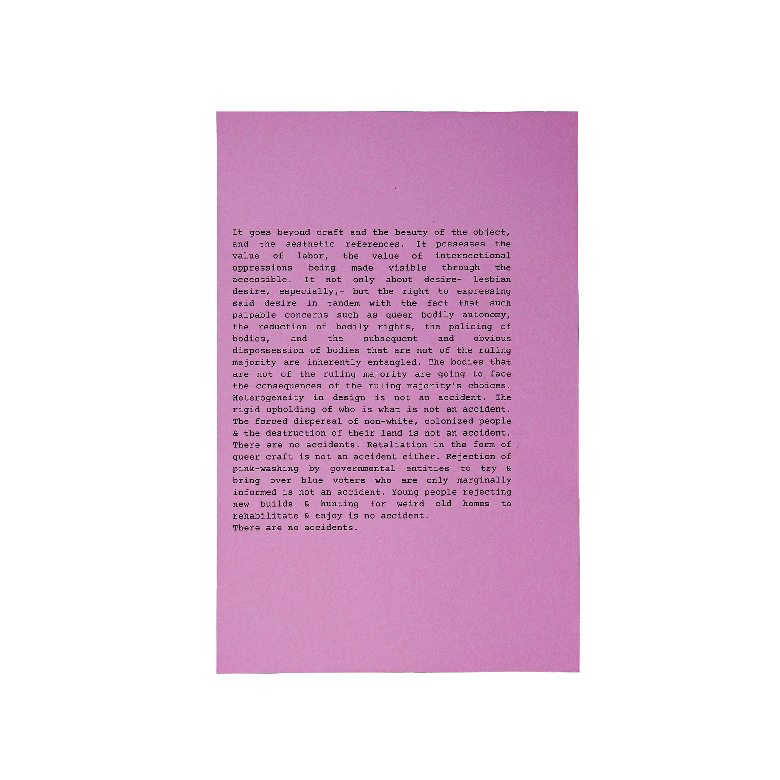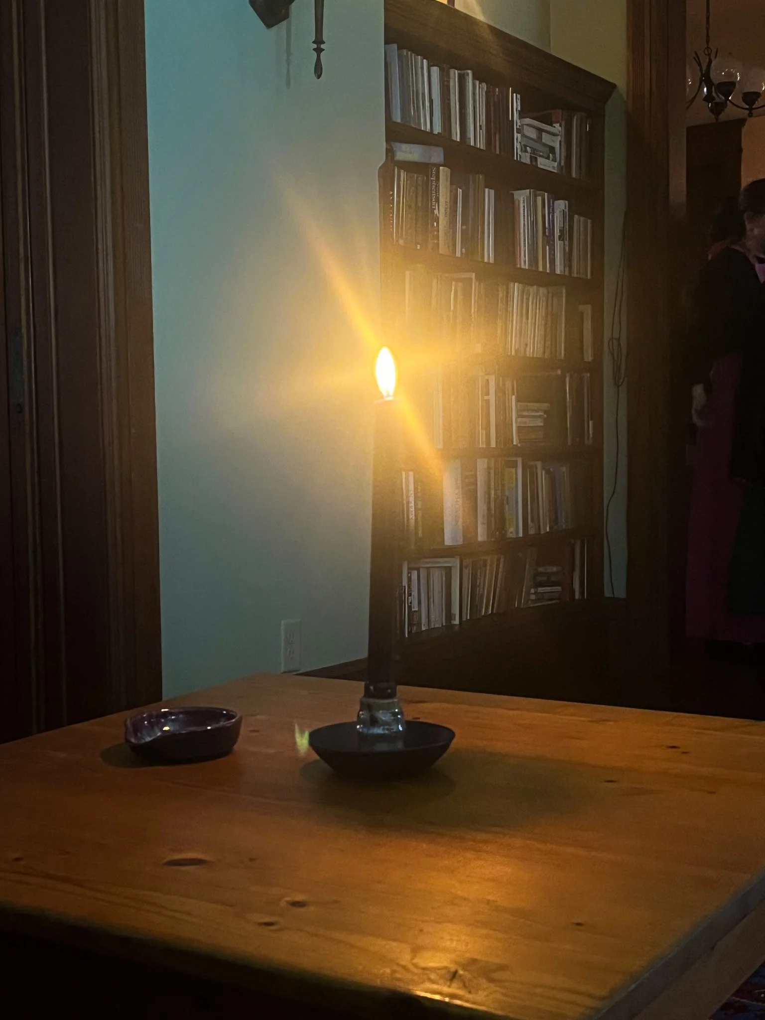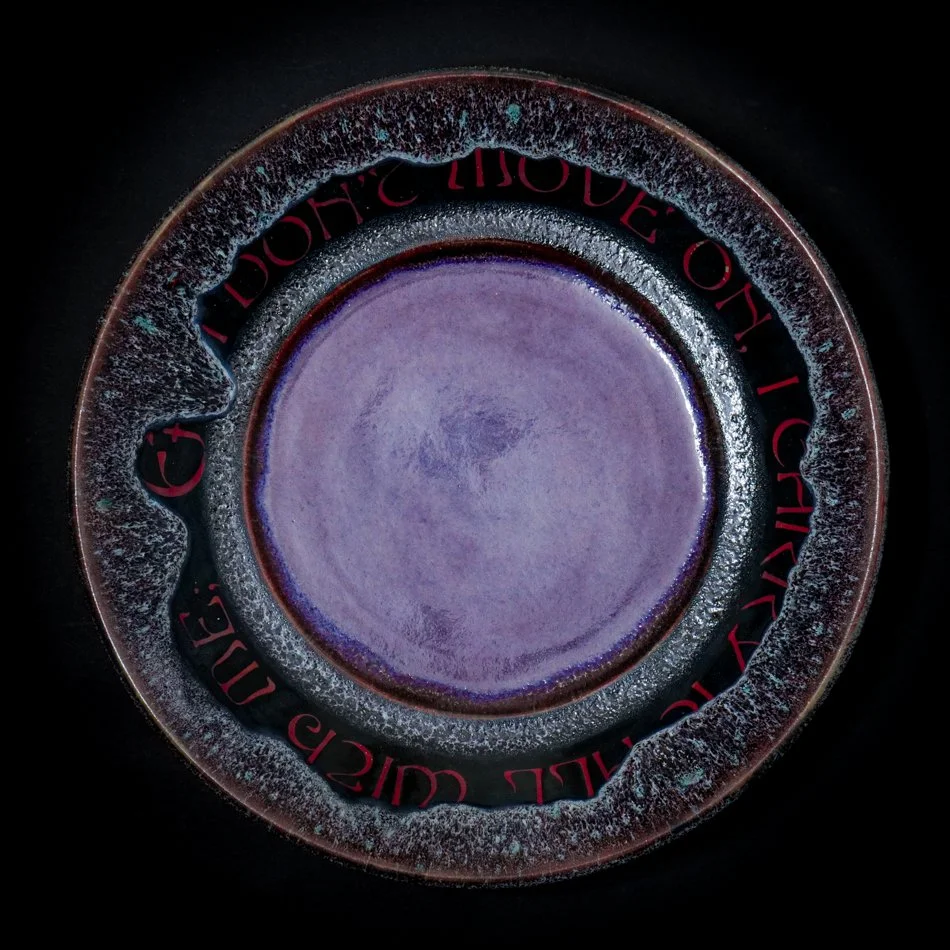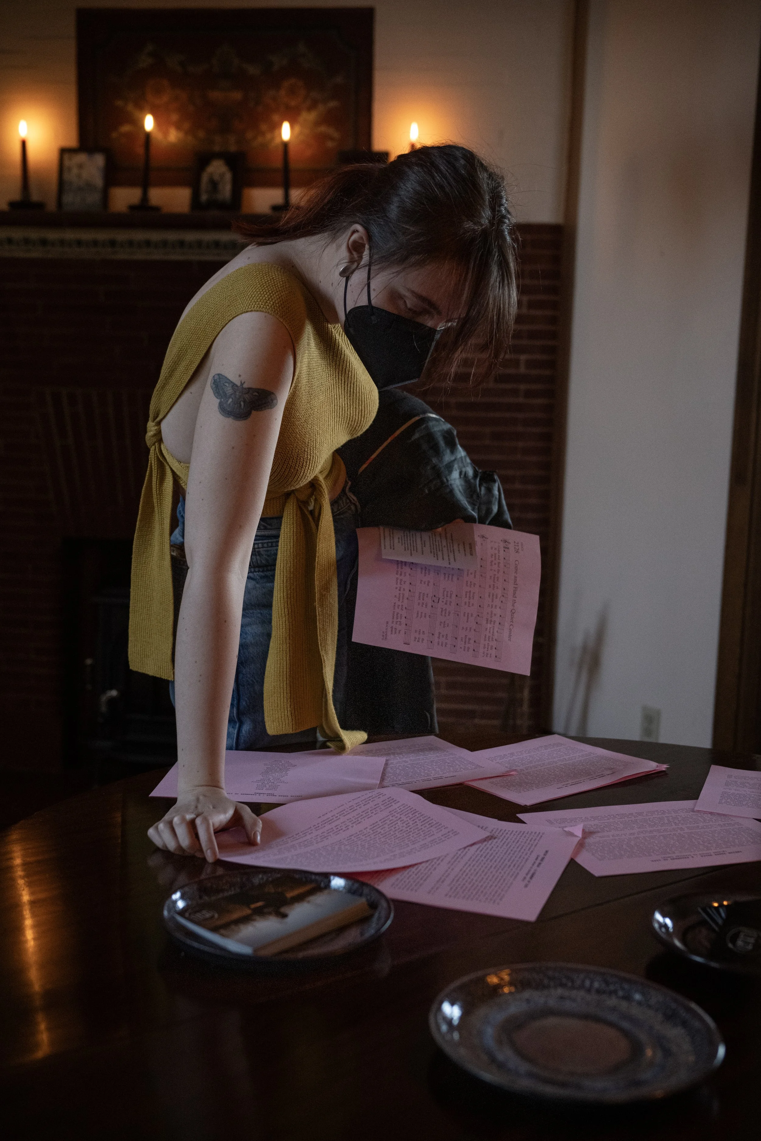 The first floor negotiates with the politics of the dinner table, family, and pilgrimage. Those at the dinner party are reciting internalized sentiments about hunger and queer desire from ceramic surfaces. Some phrases are lifted directly out of my lesbian romance novel; featured upstairs. The living room, activated sonically by the piano playing ‘Come & Find the Quiet Center,’ is overwhelmed with free-floating documentation and reflections from my 2022 and 2023 pilgrimages to Denmark and England, and my 2023 pilgrimage to Spain.