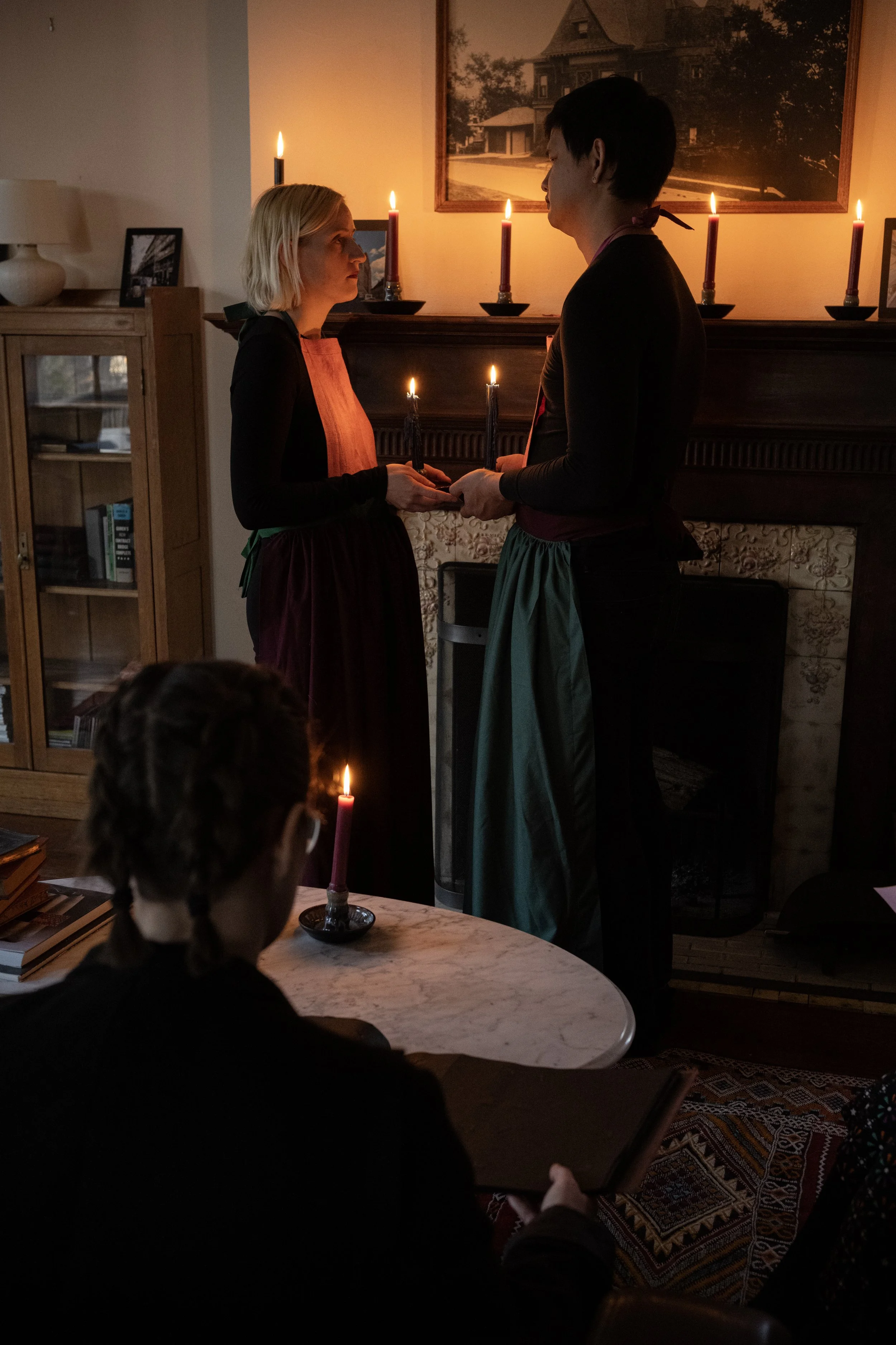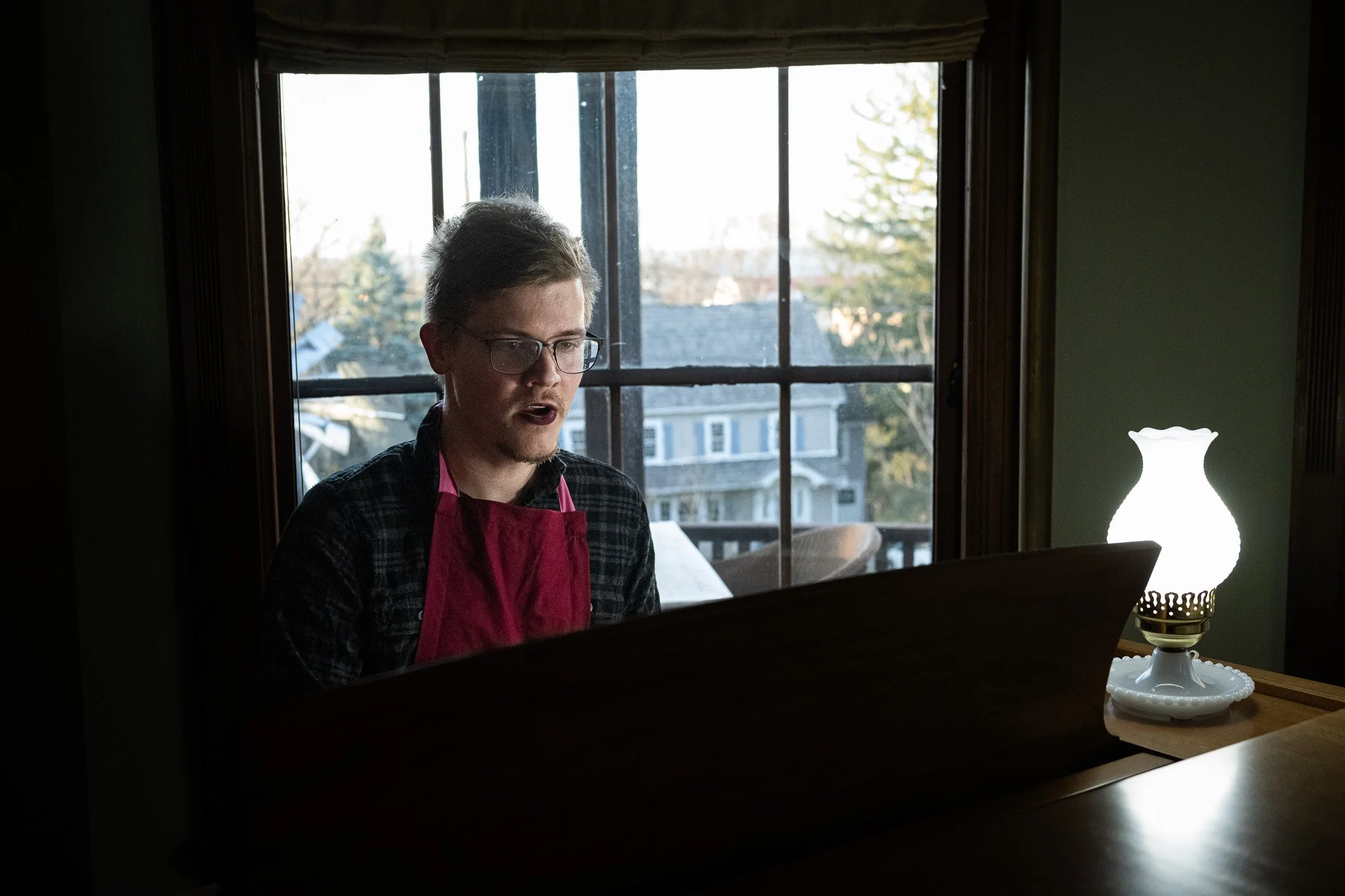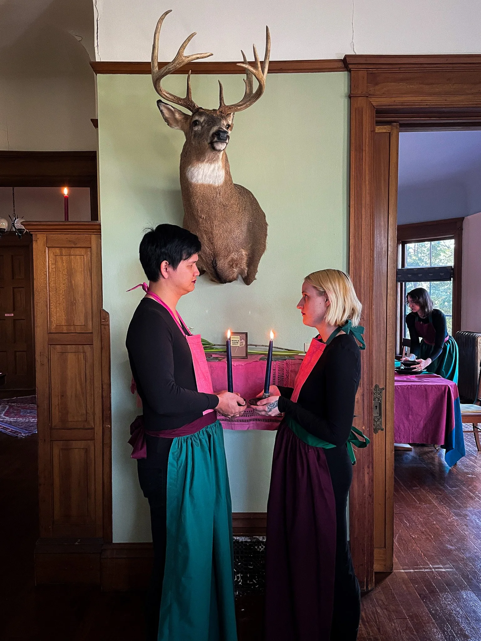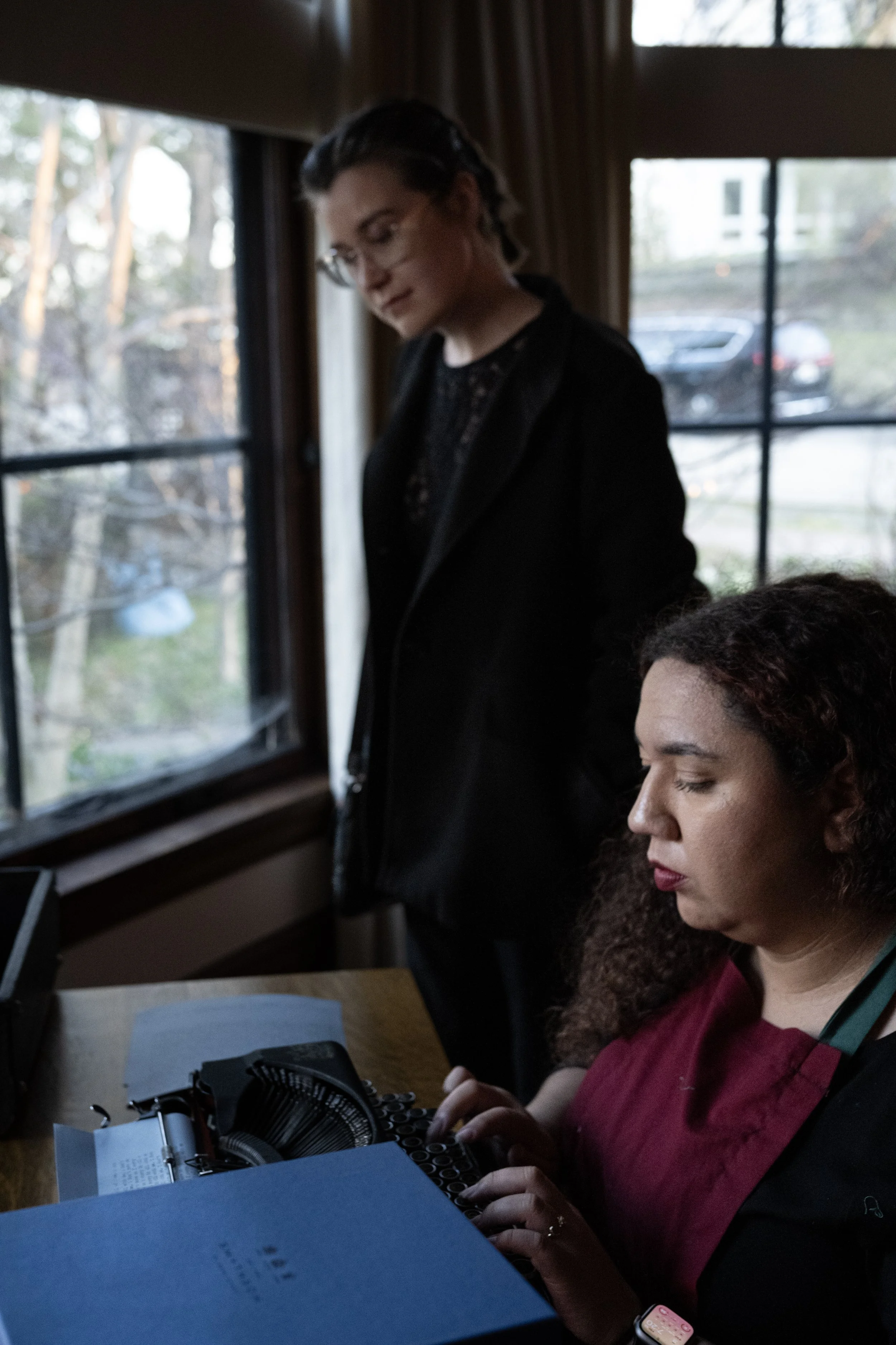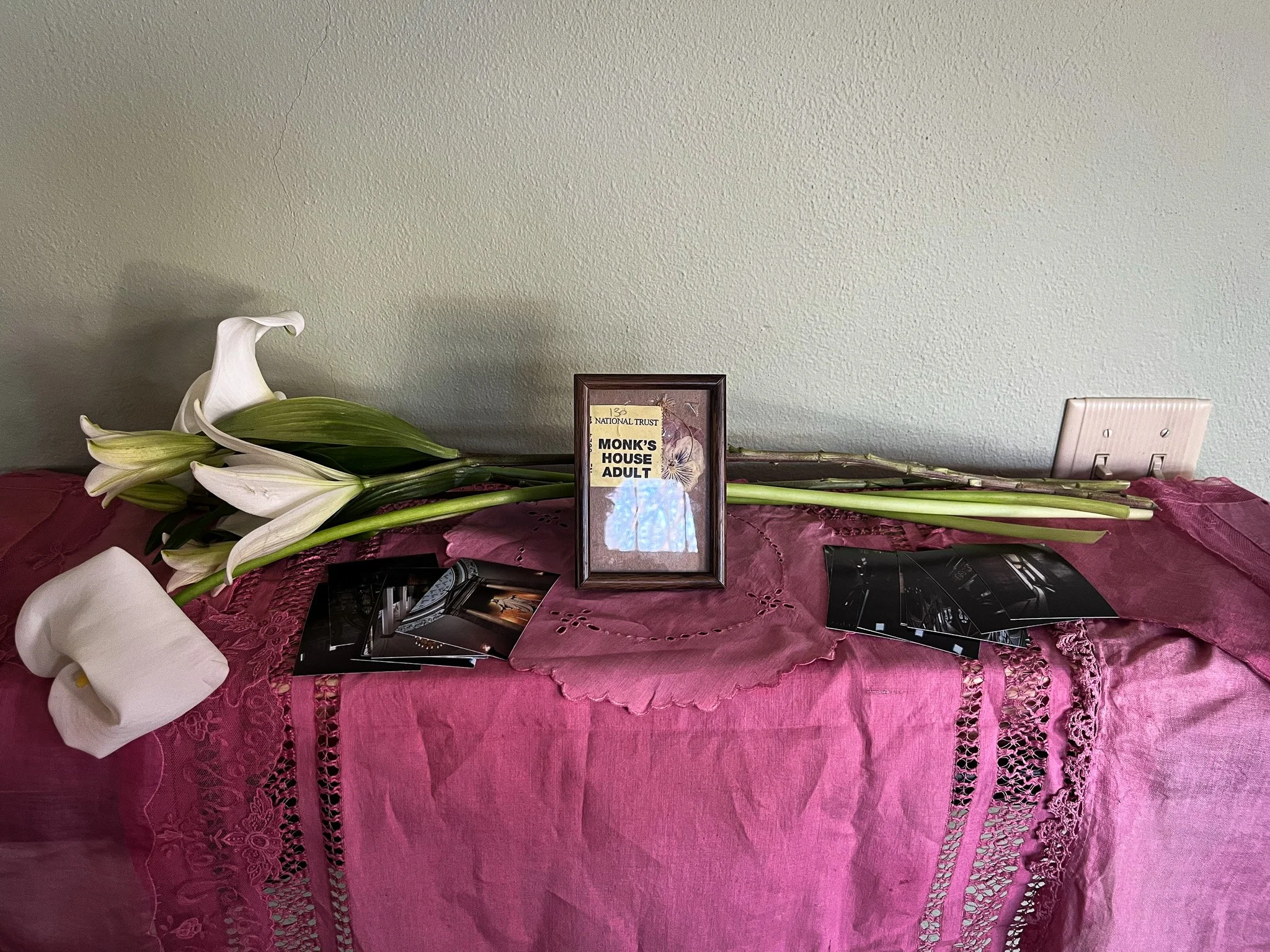 The first floor negotiates with the politics of the dinner table, family, and pilgrimage. Those at the dinner party are reciting internalized sentiments about hunger and queer desire from ceramic surfaces. Some phrases are lifted directly out of my lesbian romance novel; featured upstairs. The living room, activated sonically by the piano playing ‘Come & Find the Quiet Center,’ is overwhelmed with free-floating documentation and reflections from my 2022 and 2023 pilgrimages to Denmark and England, and my 2023 pilgrimage to Spain.