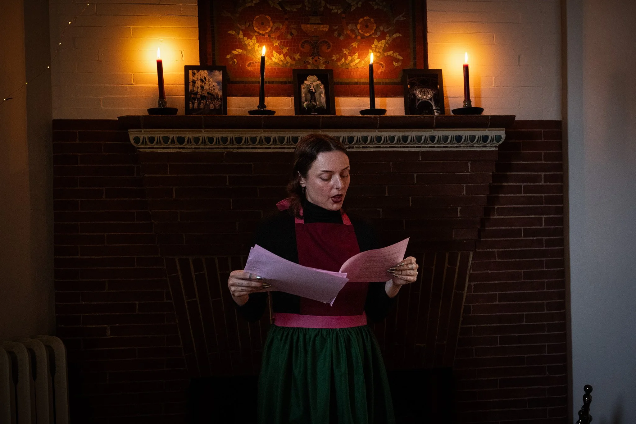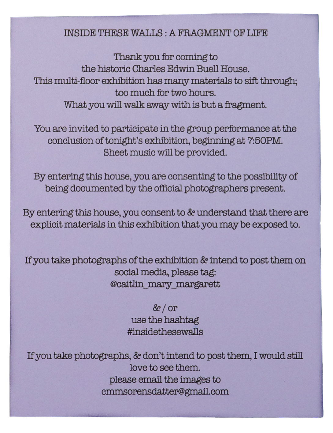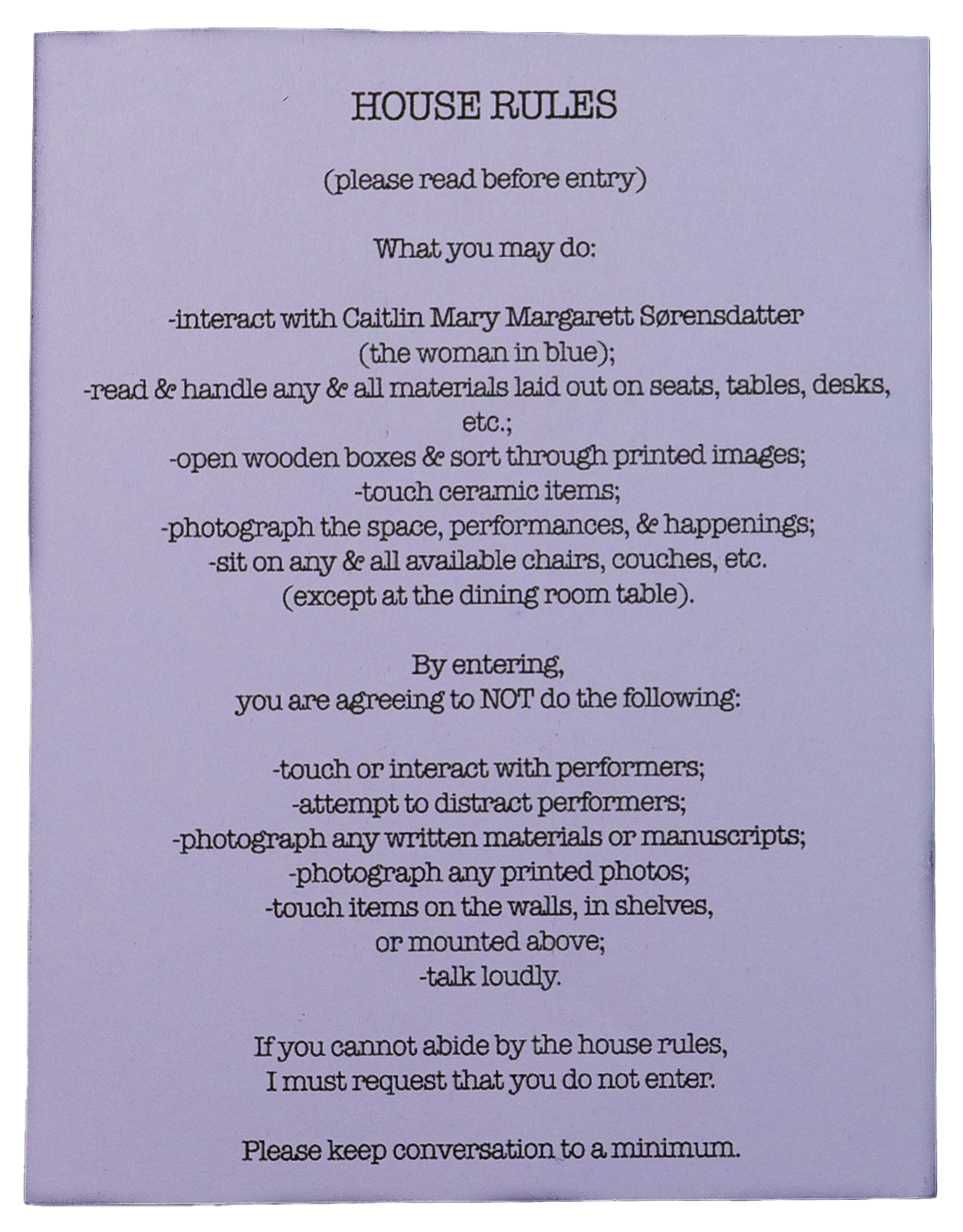 Upon entry to the exhibition, house guests were greeted by a performer who gave out copies of the “house rules.”