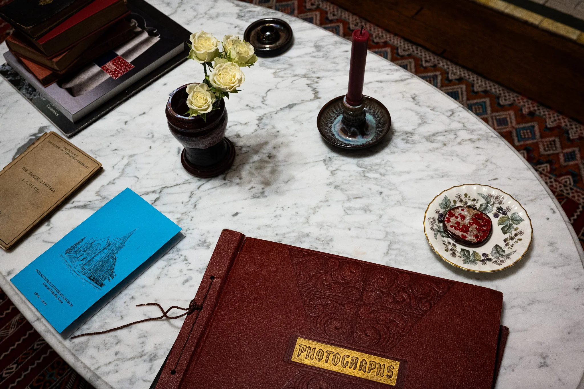 In the den, there was an array of articles, books, and resources related to pilgrimages through Iowa to churches of my matrilineal line.