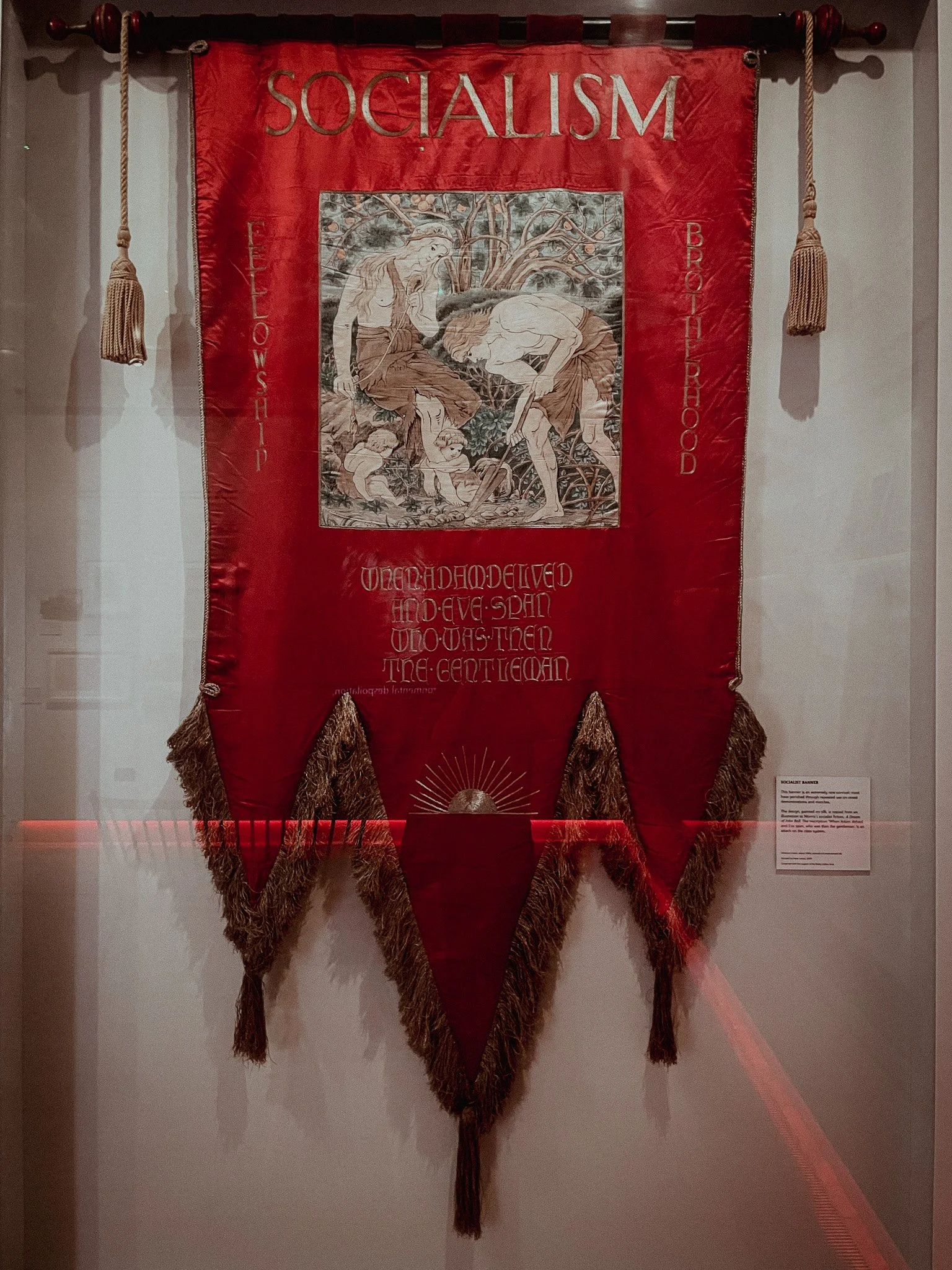 Morris’ SOCIALISM banner, currently on display in the William Morris Gallery Walthamstow, London, United Kingdom was something I sought out in October 2023. My photograph of the banner, alongside the book I originally found it in, were on the desk at the back of the attack; laying alongside a compilation of Morris’ novels.
