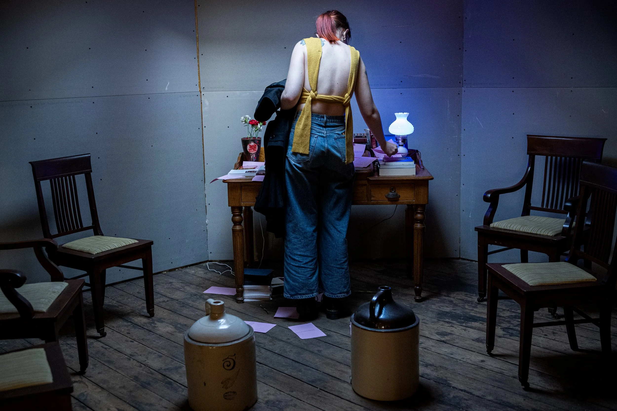 This space attempts to heavily echo the socialist activist and godfather of the Arts and Crafts movement, William Morris, and his equally formidable daughter, May Morris. As a craftswoman, my job is to turn my gaze upon labor practices, to consider what it means to generate arts, craft, and narrative under capitalism, and to reject automation for the sake of automation. Akin to the inclusion of my own novel on the second floor, I am including a collection of Morris’ socialist imaginative landscape; novels and poetry tagged for the audience to peruse at their leisure. I additionally provide some of my own writing, durational performance that negotiates correspondence and address, and published content surrounding reflections on the intersecting crises the world faces.